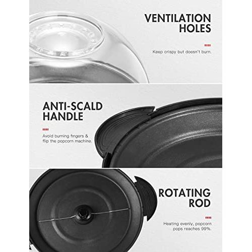 SPECIAL DESIGN: The vent holes design can prevent steam or condensation buildup in the clear lid, ensuring that the popcorn stays crispy. The cool-touch handles design can prevent scalding when you invert the popping plate.